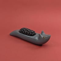 Sculpted out of air dried clay, painted with acrylic paint and a glossy varnish as a final coating. And has a textile cushion filled with cotton.